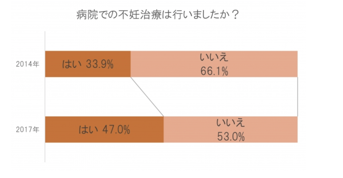 2017年に子ども服やベビー服などで知られているミキハウスを手がける三起商行株式会社が会員向けに行った妊活アンケートによると、妊活を実施した人は56.1%、そのうち、病院での不妊治療経験者は3年前の33.9%から47.0%に増加したという結果が出ています。