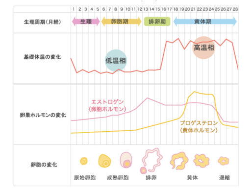 排卵期以降に分泌量が増えるプロゲステロンには、体温を上昇させる働きがあるため、排卵を境に基礎体温が2相に分かれているように見えます。月経周期と基礎体温があることにより、妊娠できる身体のリズムが整っているかどうかが見えてきます。