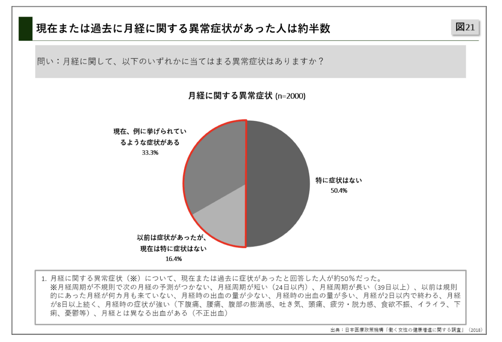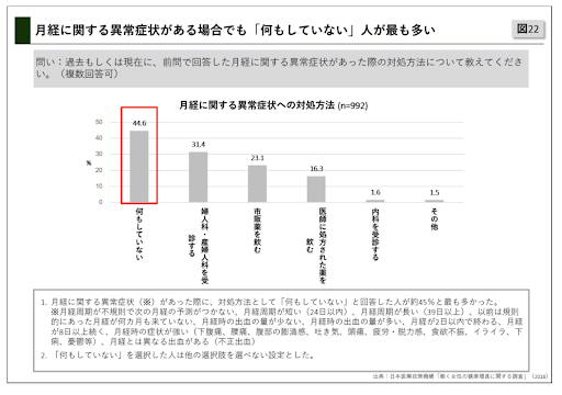 「働く女性の健康増進に関わる調査2018」によると、現在または過去に月経に関する異常症状があった人は約半数、そのうち、異常を感じながらも何もしていないと回答した方は45%近くという結果が出ています。