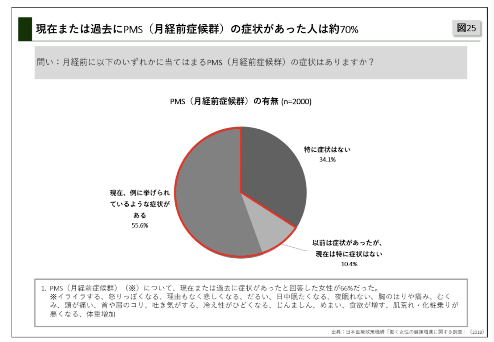 日本医療政策機構が発表した「働く女性の健康増進に関わる調査2018」によると、現在または過去にPMS(月経前症候群)の症状があった人は実に70%近くである一方、それに対して何もしていていないと回答した割合は60%を超えているという結果が出ています。